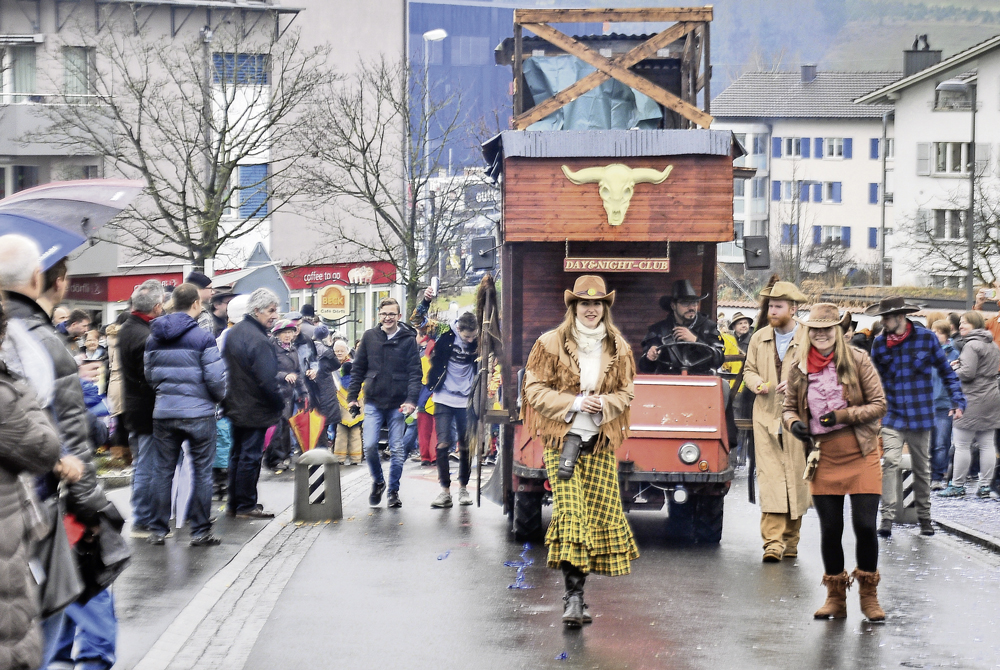 sh. Zahlreiche maskierte und beschirmte Zuschauer standen am Strassenrand und applaudierten, als die Schlitzäugler aus dem Wilden Westen den Umzug eröffneten. Dieses Jahr bastelten sie einen mottogerechten Umzugswagen, da die Schlitzäugler derzeit nur neun Aktive zählen – zu wenige, um als Guuggenmusig in Erscheinung zu treten. Und trotzdem stellten sie die Dörflifasnacht auf die Beine. Da ist die Mithilfe eines jeden einzelnen wichtig! Insgesamt bot der Umzug 17+1 tolle Sujetnummern, darunter auch neun Guuggenmusigen und die Schule Dierikon, die seit langem wieder einmal präsent war. Mit dabei war natürlich auch die Dörflizunft Dierikon mit Zunftmeisterin Irène I. unter dem Motto «Im Himmel ist die Hölle los».