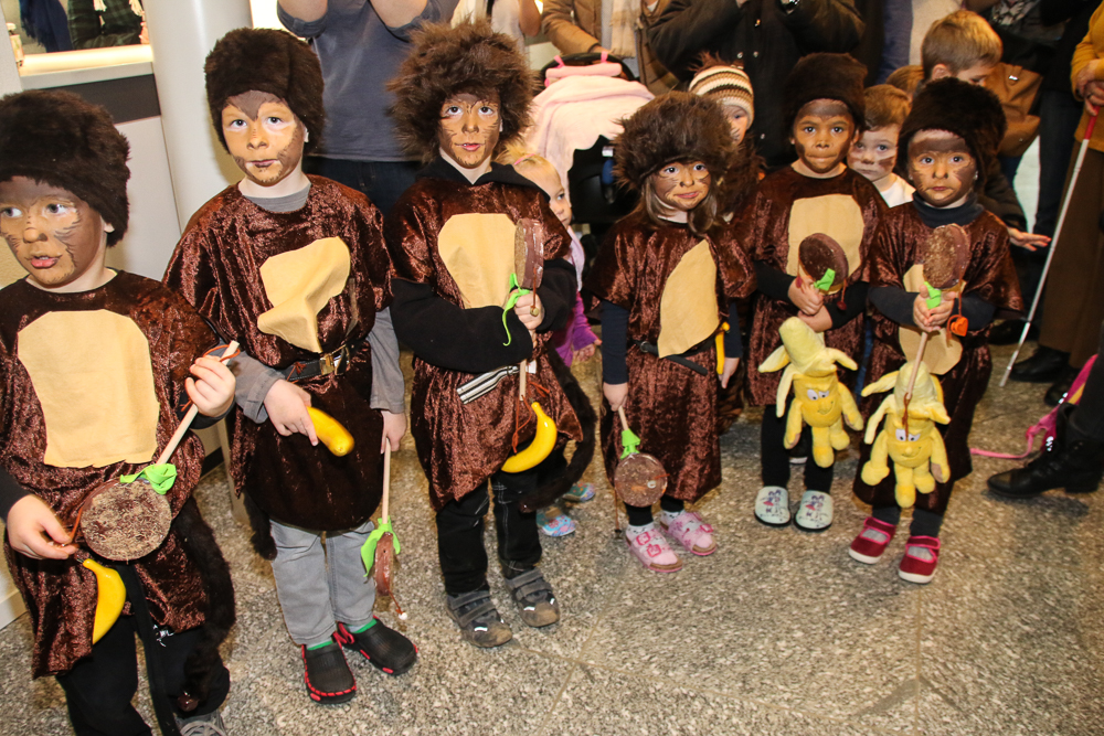 bh. Am Fasnachtsdonnerstag wurden 23 Affen in der Gemeinde Dierikon losgelassen, wodurch ein richtiges Tohuwabohu im Gemeindehaus ausbrach. Geschminkt, verkleidet, mit Bananenproviant ausgerüstet und mit selbst gebastelten Kokosnussrasseln in der Hand sahen die zweieinhalb- bis fünfjährigen Kinder einfach herzig aus. Überall im Haus suchten sie nach Kokosnüssen und bei ihren Darbietungen zu den zwei Lieblingstiteln «Die Affen suchen nach der Kokosnuss» und «Der Gorilla mit der Sonnenbrille» ging die Post so richtig ab. Eltern, Geschwister, Zunftmeister,  Zunftweibel und alle Anwesenden liessen sich vom Rhythmus anstecken. Für den Zunftmeister-Ehrenbesuch wurde eine Extra-Tanzrunde zum Besten gegeben. Die Zünfter waren von der Darbietung so begeistert, dass sie sich mit einem Säckli Süssigkeiten für jeden Künstler bedankten. Die Affen ihrerseits zeigten ihr Wohlwollen mit einer Extraportion Vitamine in Form eines Bananenbunds. Dank den Mamis gab es eine grosse Auswahl an Kuchen für alle Besucher und Teilnehmer.