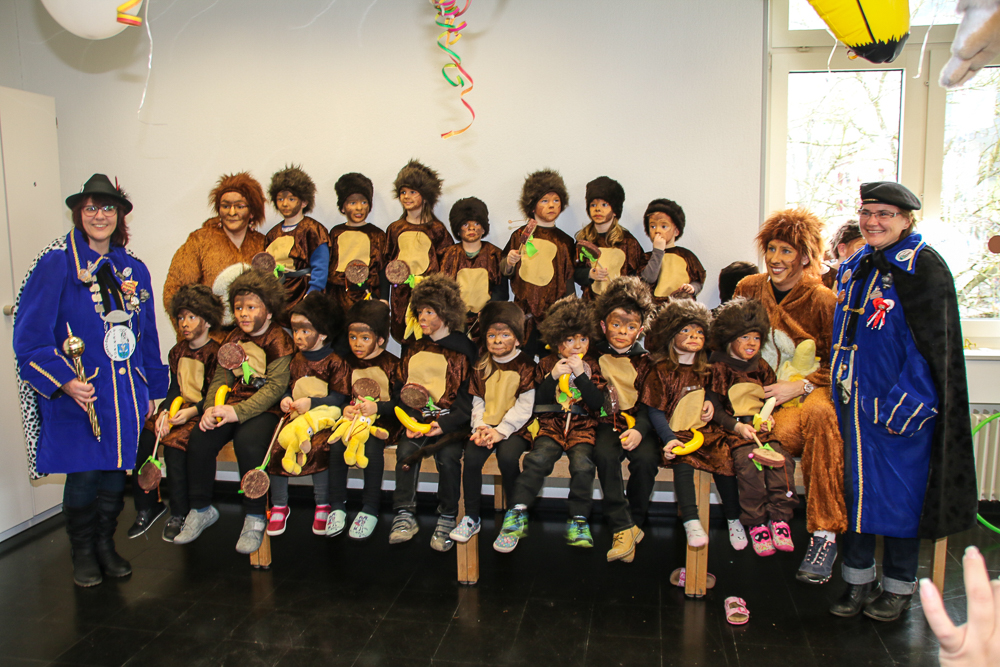 bh. Am Fasnachtsdonnerstag wurden 23 Affen in der Gemeinde Dierikon losgelassen, wodurch ein richtiges Tohuwabohu im Gemeindehaus ausbrach. Geschminkt, verkleidet, mit Bananenproviant ausgerüstet und mit selbst gebastelten Kokosnussrasseln in der Hand sahen die zweieinhalb- bis fünfjährigen Kinder einfach herzig aus. Überall im Haus suchten sie nach Kokosnüssen und bei ihren Darbietungen zu den zwei Lieblingstiteln «Die Affen suchen nach der Kokosnuss» und «Der Gorilla mit der Sonnenbrille» ging die Post so richtig ab. Eltern, Geschwister, Zunftmeister, Zunftweibel und alle Anwesenden liessen sich vom Rhythmus anstecken. Für den Zunftmeister-Ehrenbesuch wurde eine Extra-Tanzrunde zum Besten gegeben. Die Zünfter waren von der Darbietung so begeistert, dass sie sich mit einem Säckli Süssigkeiten für jeden Künstler bedankten. Die Affen ihrerseits zeigten ihr Wohlwollen mit einer Extraportion Vitamine in Form eines Bananenbunds. Dank den Mamis gab es eine grosse Auswahl an Kuchen für alle Besucher und Teilnehmer.
