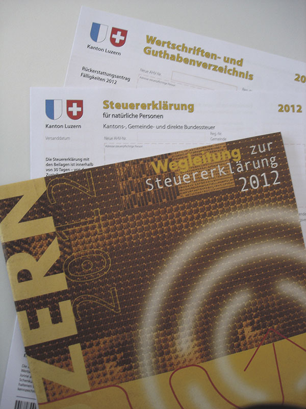 Neu werden die Unterlagen zur Steuererklärung 2012 nicht mehr vom Steueramt Ebikon, sondern von einem externen Druckzentrum gedruckt und versandt. Der zentrale Versand wird voraussichtlich ab Mitte Februar 2013 stattfinden. Wenn die Steuererklärung in der Vorperiode elektronisch ausgefüllt wurde, wird aus ökologischen und ökonomischen Gründen auf die Zustellung der Hilfsformulare, der Wegleitung zur Steuererklärung und der CD mit der Steuersoftware verzichtet. Die aktuellste Version der Steuersoftware kann ab Anfang Februar 2013 unter http://www.steuern.lu.ch/index/steuererklaerung_natp.htm kostenlos heruntergeladen werden.