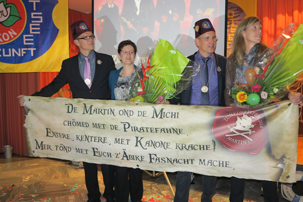 Ehe Peter Mühlebach jedoch das Kandidatenkarussel in Gang setzte, mussten die Anwesenden dem neuen Zunftmeister blanko ihre Stimme geben, weil die neuen Statuten eine offene Wahl beinhalteten. Als Peter I. die Kandidaten für seine Nachfolge auf der Leinwand erscheinen lassen wollte, versagte plötzlich das Mikrophon, was die ganze Sache noch spannender machte. Schliesslich funktionierte alles wieder, und der Reigen konnte beginnen. «Leider nein», hiess es rund ein Dutzend Mal – einmal wegen der falschen Kravatte, einmal aus anderen triftigen Gründen. Schliesslich war aber doch einer dabei, der das Zepter an der Fasnacht 2014 führt: es ist Martin Aregger, ein waschechter Ebikoner, der aus der ehemaligen Kohlenhändler-Dynastie Aregger stammt und heute als Lichtplaner und Lichtdesigner in Luzern tätig ist. Als Weibel amtiert Architekt Michael Kreyenbühl, dessen Vater Ende der 80er Jahre lange das Amt des Dekorationschefs in der Rotseezunft bekleidete. Sie stellen die kommende Fasnacht unter das Motto «Piraten»: De Martin ond de Michi chömed met de Piratefahne / Entere, kentere, met de Kanone krache / Mer tönd met euch z Äbike Fanacht mache. Wie der neue Zunftmeister verriet, haben sie mit diesem Motto vor allem an die Kinder gedacht, nicht nur die eigenen insgesamt fünf, sondern auch alle anderen in der Gemeinde. Viele Zünftler hatten entweder auf den einen oder anderen Namen getippt, die richtige Paarung stand aber nur auf einem einzigen Zettel, jenem von Alois Kaufmann.