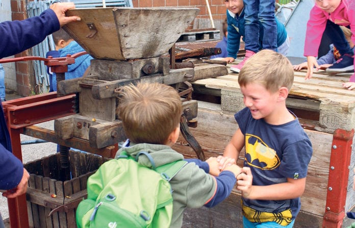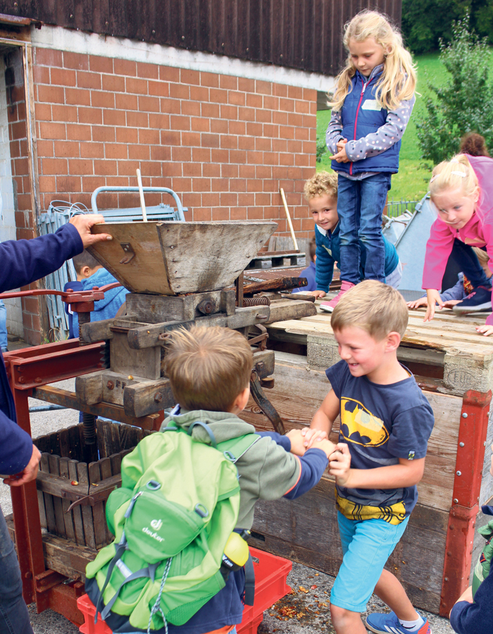 Danach schüttelte Urs Krummenacher an einem Apfelbaum und die Äpfel fielen zu Hunderten von den Ästen. Diese wurden von den Kindern aufgelesen, probiert, sortiert und gewaschen. Die köstlichen Äpfel wurden dann mit einer antiken Mostpresse zu süssem Apfelsaft gepresst.