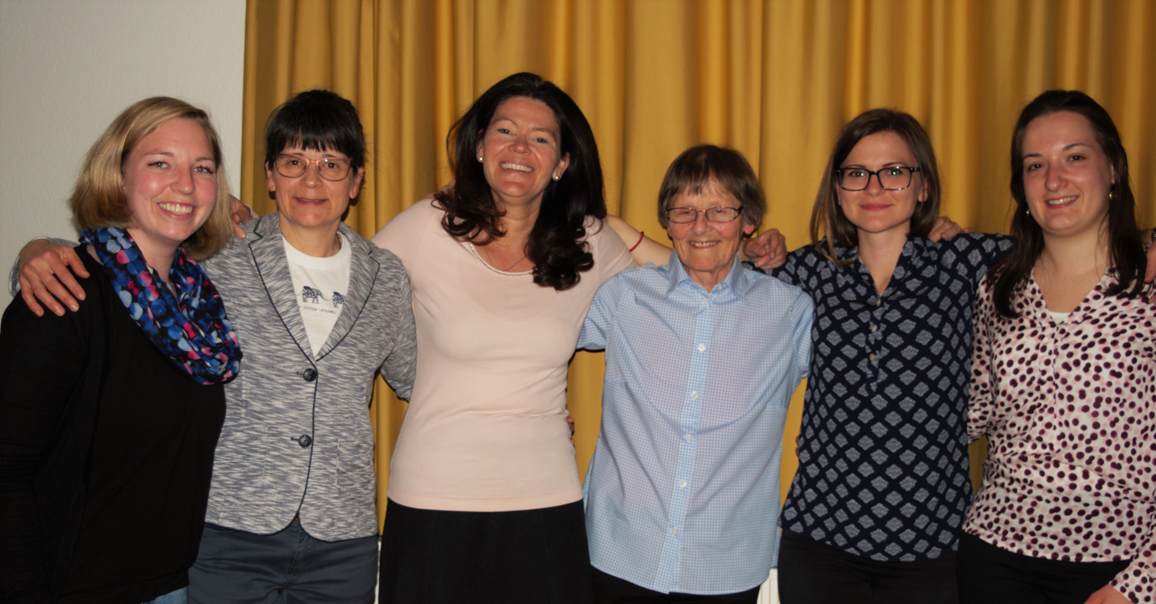 Foto 1: Der wiedergewählte Vorstand mit den zwei zurückgetretenen Mitgliedern Nadine Rickenbacher (ganz links) und Gertrud Wirz (dritte von links)