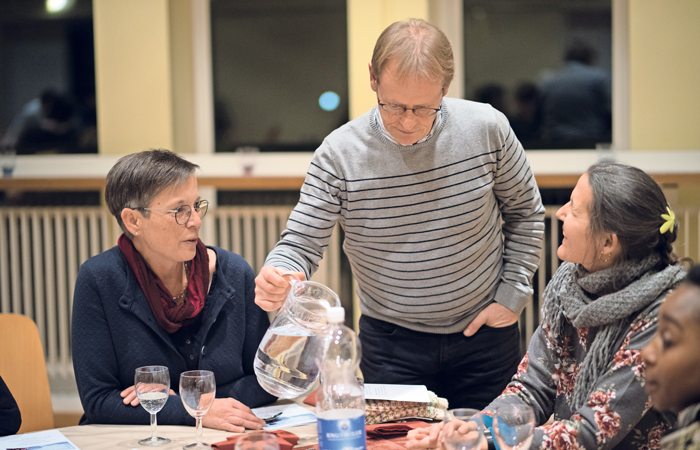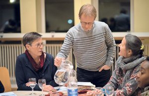 Empfangen wurden die Gäste mit Kerzenschein und einem Apéro. Und wie die Leute nach und nach eintrafen, wurde schnell ersichtlich, dass es sich hier um eine bunt durchmischte Festgesellschaft handelt. Da waren Familien mit kleinen Kindern, Alleinstehende, ältere Leute mit Partnern, Freunde, Bekannte und das eine oder andere unbekannte Gesicht. Im festlich dekorierten Saal wurden die Gäste zu Tisch gebeten, so dass die zwölf freiwilligen Helfenden das viergängige Menü servieren konnten. Auch dieses Jahr verwöhnte die Küche des Zentrum Höchweid die Gäste mit einem ausgezeichneten Festessen. Zwischen Süsskartoffelsuppe, Salat und Weihnachtsbraten wurden Sprachbarrieren durchbrochen und neue Kontakte geknüpft.