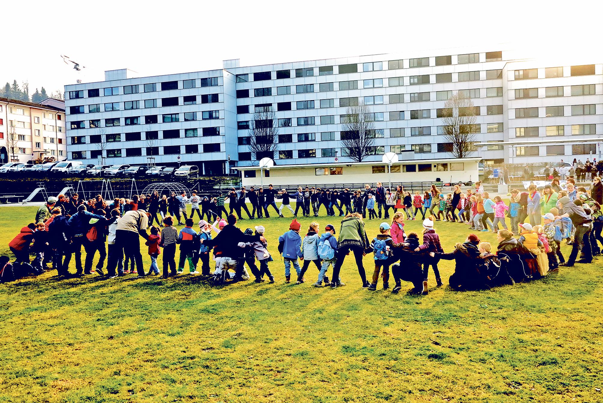 Auch Susi und Fritz waren da. Ganz aufgeregt fragten die beiden ihre Eltern, ob auch sie zu den Pfadis gehen dürfen. Mama und Papa fanden das grundsätzlich eine super Idee, stellten aber eine kleine Bedingung: Zuerst sollten Fritz und Susi mit ihnen das Pfadi-Leiterlispiel spielen, um herauszukriegen, was man denn in der Pfadi alles so erlebt und ob es ihnen denn auch wirklich gefällt. Super Idee! Fanden auch die organisierenden Pfader und machten ganz einfach bei diesem riesen Leiterlispiel mit. Biber, Wölfli, Bienli, Pfadis und PTAler kämpften sich jeweils mit ihren Spielfiguren in Richtung Ziel. Auf jedem Feld erwartete die Gruppen ein kleines Pfadi-Abenteuer.