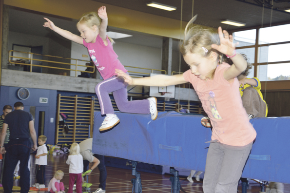 Das Interesse am Vaki-Turnen war riesig: Über 70 Väter sind mit ihren Kindern am Samstagmorgen, 9. November, in die Dreifachturnhalle Wydenhof gepilgert, um mit ihrem Nachwuchs gemeinsam zu turnen und den Plausch zu haben. Die Muki-Verantwortliche Irène Kirchhofer und ihr Leiterteam Edith Brun und Astrid Kaiser haben Posten aufgestellt, die der Reihe nach von allen absolviert wurden.
