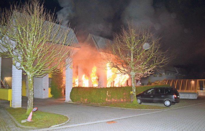 Eine Polizeipatrouille stellte im Gewerbegebiet Winkelbüel verdächtigen Rauch und Rauchgeruch fest. Bei näherer Kontrolle wurde offenes Feuer festgestellt. Die Feuerwehr rückte mit einem grossen Aufgebot aus und konnte den Brand löschen. Zwei Personen wurden evakuiert. Es gab keine Verletzten, aber grossen Gebäudeschaden.