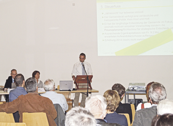 Am Donnerstag, 7. November, fand in der Aula des Schulzentrums Hinterleislibach die Orientierungsveranstaltung für die Gemeindeabstimmung vom 24. November statt. Dabei informierte der Gemeinderat unter anderem über den Voranschlag 2014 mit laufender Rechnung, die Investitionsrechnung und die neue Festsetzung des Steuerfusses. Weiterhin wurden an diesem Abend das Jahresprogramm 2014 und der Finanz- sowie der Aufgabenplan für den Zeitraum von 2014 bis 2020 vorgestellt.