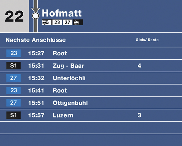 pd/Red. Neben den Fahrplänen zur Information vor der Fahrt, sind zuverlässige Informationen während der Fahrt für die Passagiere des öffentlichen Verkehrs von grosser Bedeutung. Deswegen zeigt vbl in Zusammenarbeit mit dem Verkehrsverbund Luzern neu auf den Bildschirmen im Bus Umsteigebeziehungen auf andere Bus- und Bahnlinien an. Damit die Informationen auch bei grossem Verkehrsaufkommen verlässlich sind, werden die Abfahrtszeiten in „Echtzeit“ dargestellt, d.h. auch Verspätungen sind berücksichtigt