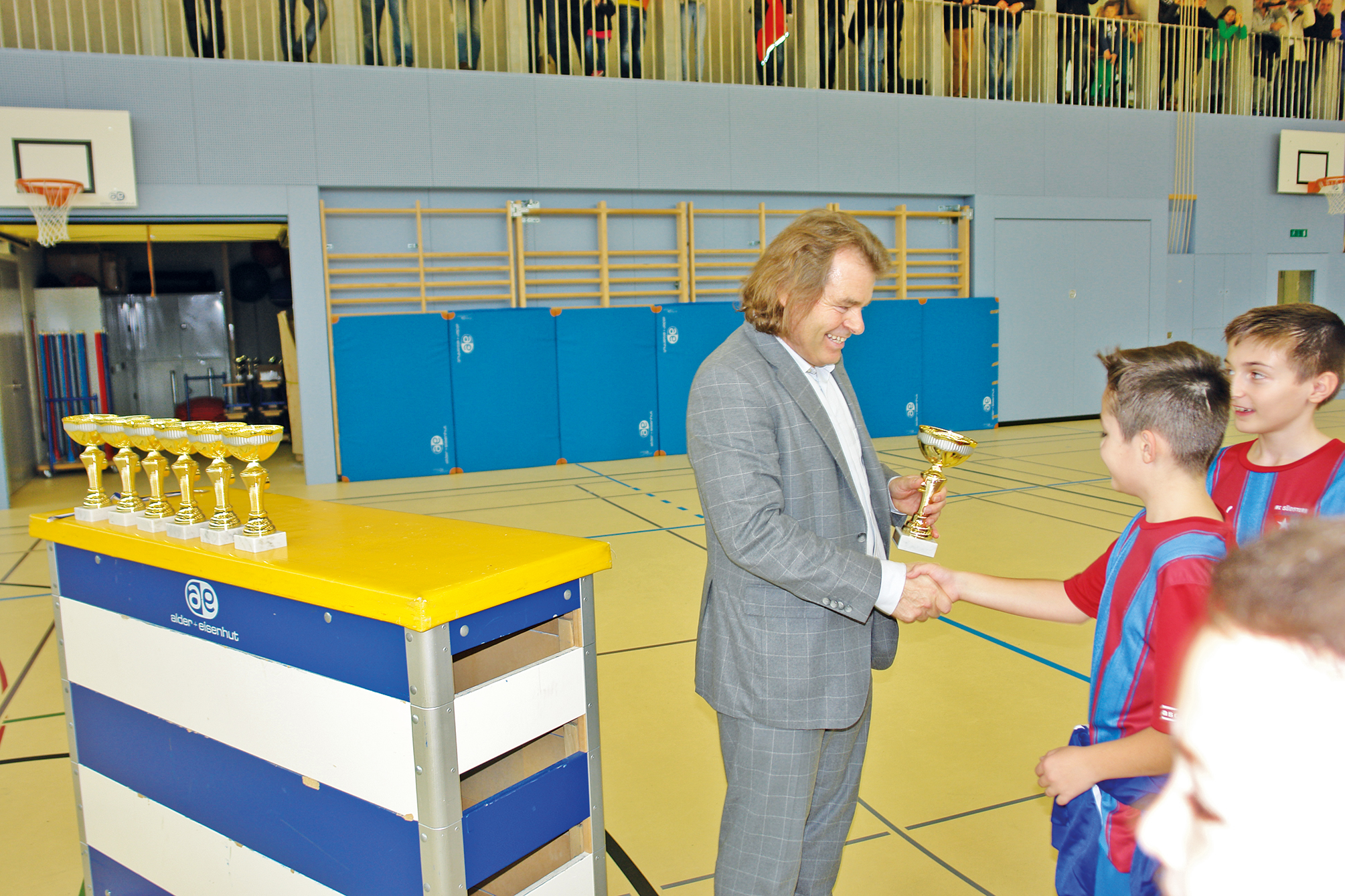 Am Samstag duellierten sich in der Turnhalle Oberfeld die D-Junioren und die Fussballschule, am Sonntag die E- und F-Junioren. Insgesamt waren 40 Teams aus der näheren und weiteren Umgebung am Werk. Nicht nur in den Finalspielen herrschte jeweils Hochstimmung auf den voll besetzten Zuschauerrängen. Am Ende wurden die Kids für ihren Einsatz mit Medaillen und Pokalen beschenkt. Turnier-Hauptsponsor Emilio Stecher vom gleichnamigen Rooter Traditionsunternehmen liess es sich nicht nehmen, bei den D-Junioren die siegreichen Mannschaften gleich selber auszuzeichnen.
